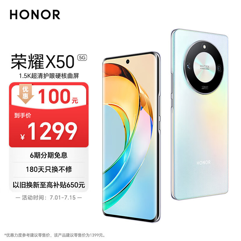 荣耀X50 代骁龙6芯片 1.5K超清护眼硬核曲屏 5800mAh超耐久大电池 5G AI手机 8GB+128GB 雨后初晴价格:1299.00元!