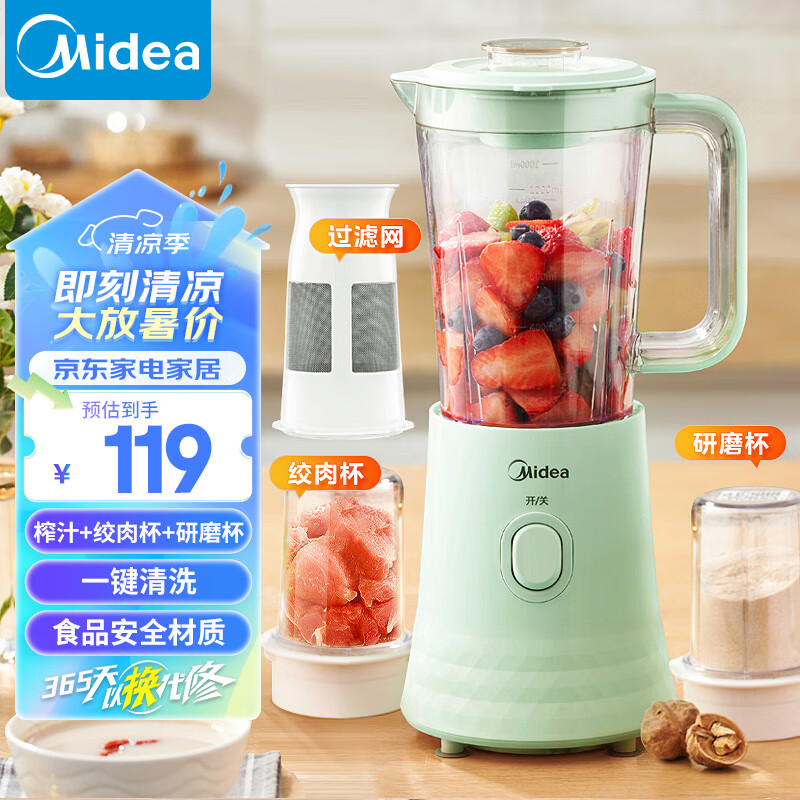 美的(Midea)榨汁料理机一机豪华三杯 家用研磨粉机智能婴儿辅食机多功能搅拌机可绞肉WBL2531H价格:119.00元!