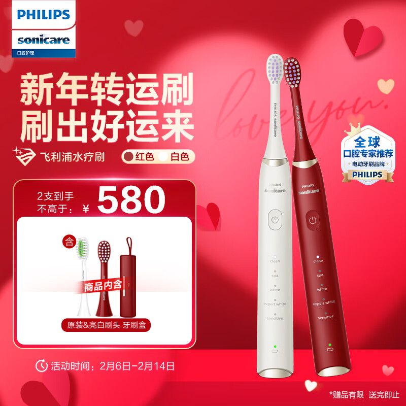 飞利浦电动牙刷HX2491白色&红色水疗刷新年 情人节礼物送女友/男友声波震动清洁亮白护龈 HX6730升级款价格:580.00元!