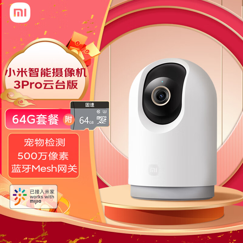 小米智能摄像机3Pro云台版+64G存储卡 监控摄像头婴儿看护器500w像素双向语音对讲内置蓝牙mesh网关价格:354.00元!