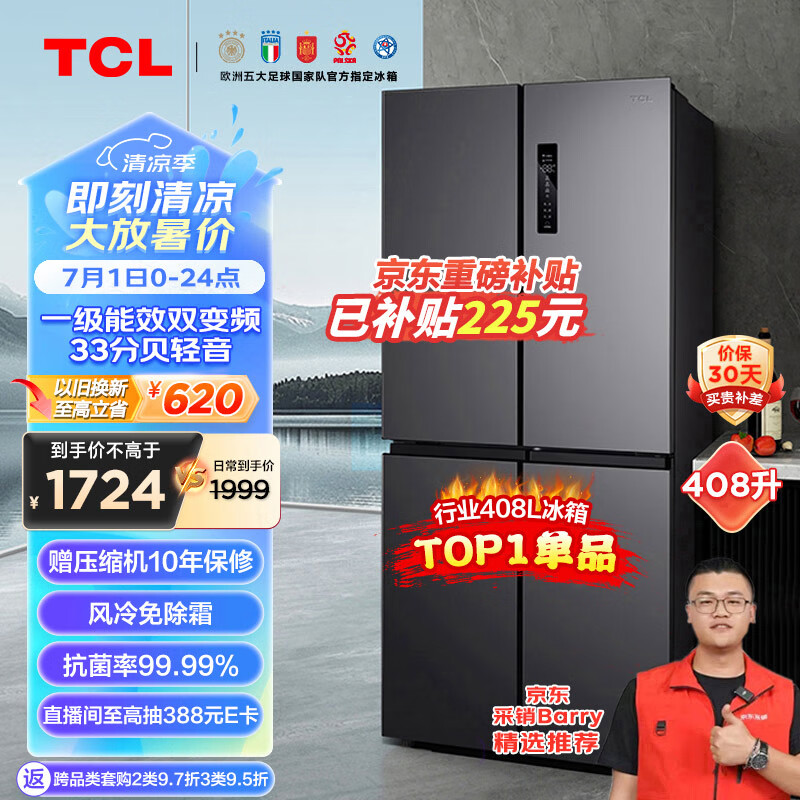 TCL 408升分区养鲜超薄十字对开双开四开多门智能一级能效风冷无霜大容量家用电冰箱BCD-408WPJD价格:1799.00元!
