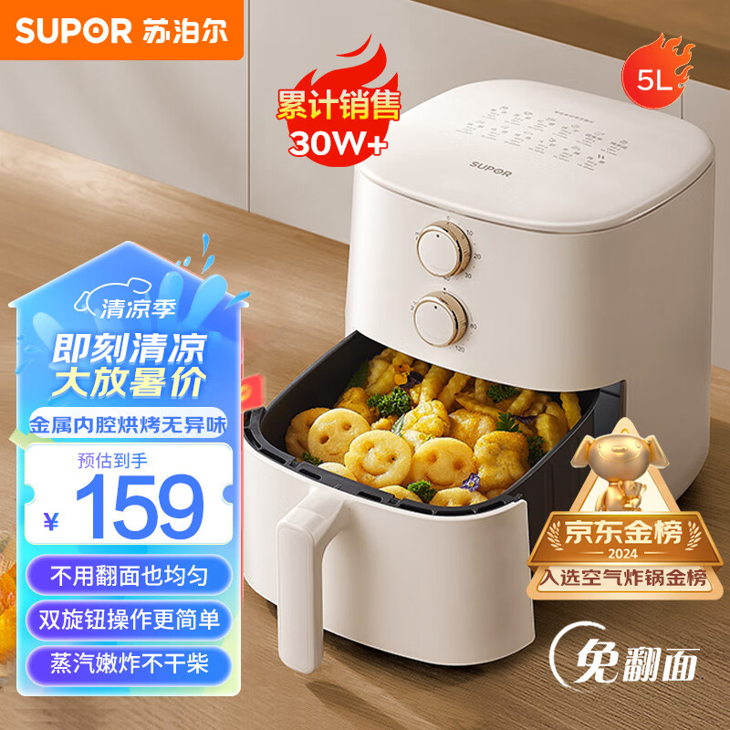 苏泊尔(SUPOR)不用翻面 5L 大容量 空气炸锅 蒸汽嫩炸 炸烤箱一体 精准控温 不沾易清洗 免翻面炸锅 KJ50D827价格:159.00元!