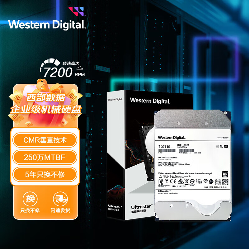 西部数据 企业级氦气硬盘 Ultrastar HC520 SATA 12TB CMR垂直 7200转 256MB (HUH721212ALE600)价格:2209.00元!