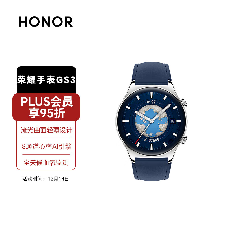 荣耀手表GS 3 环球远航智能轻奢手表14天强劲续航8通道心率AI引擎100+运动模式 位健康升级价格:1199.00元!