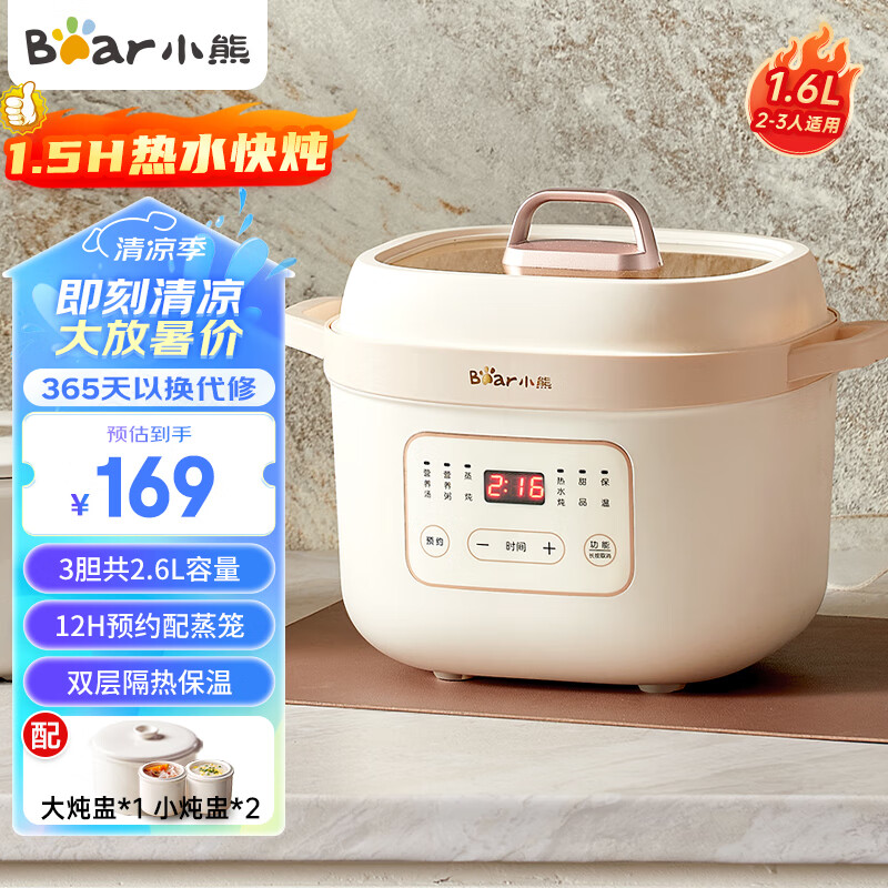 小熊(Bear)电炖锅 电炖盅 隔水炖锅 煲汤锅 炖汤盅 蒸锅 婴儿辅食锅煮粥锅燕窝可预约带蒸笼DDZ-D16C1 1.6L价格:169.00元!