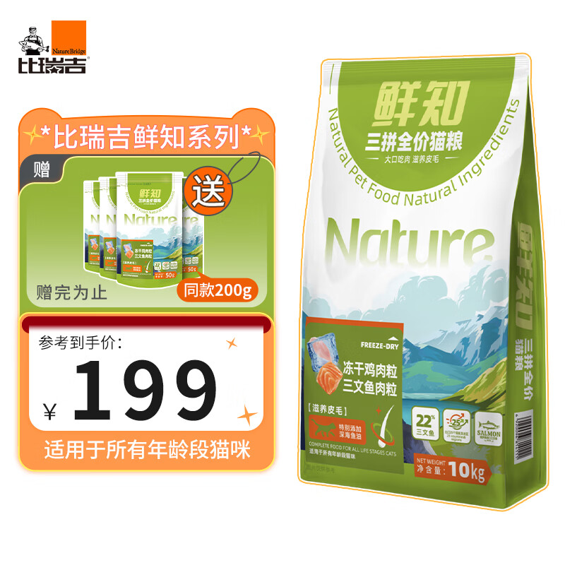 比瑞吉俱乐部鲜知系列全价猫粮成猫幼猫冻干三拼全期猫粮10kg价格:219.00元!