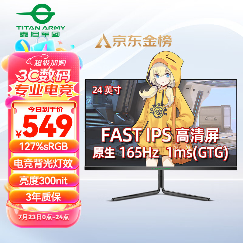 泰坦军团24英寸165Hz FastIPS电竞屏1ms(GTG)响应300nit亮度127%sRGB广色域屏幕低蓝光144电脑显示器P24A2G价格:699.00元!