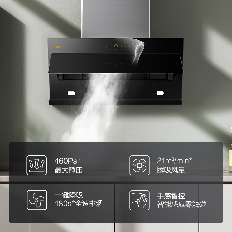 5、侧吸颜值太高了,手挥一挥即开即关,非常方便,科技感满满,灵敏度很高,吸力强,还可以每日换气,保证厨房的环境。噪音很低,性价比真的很高!!