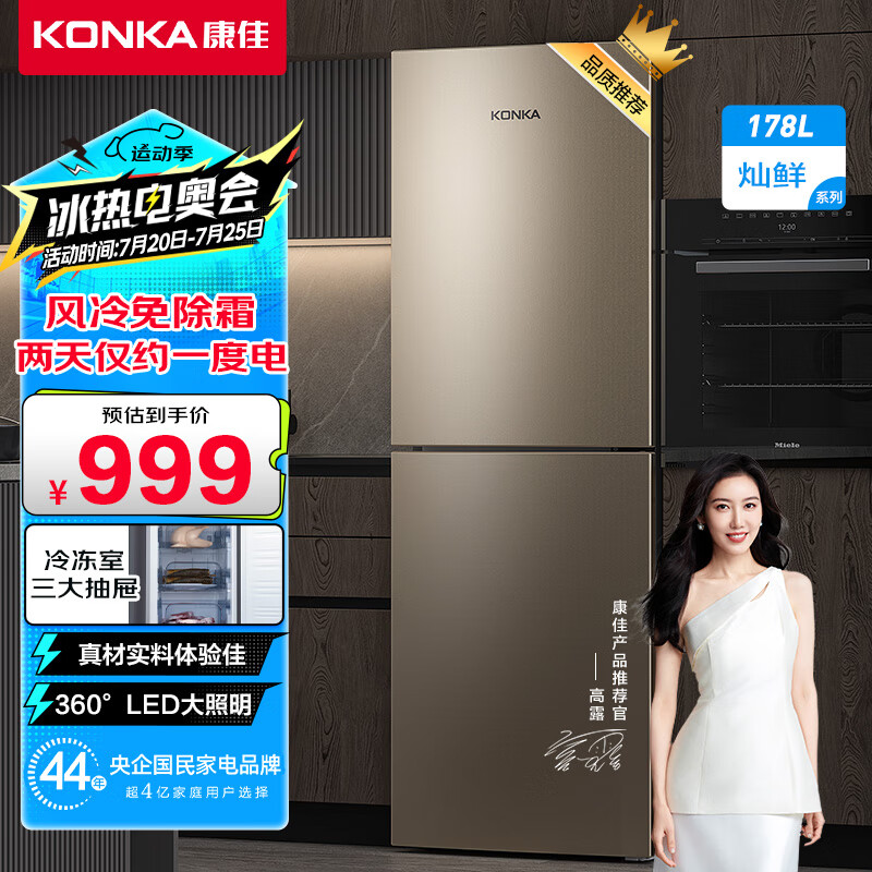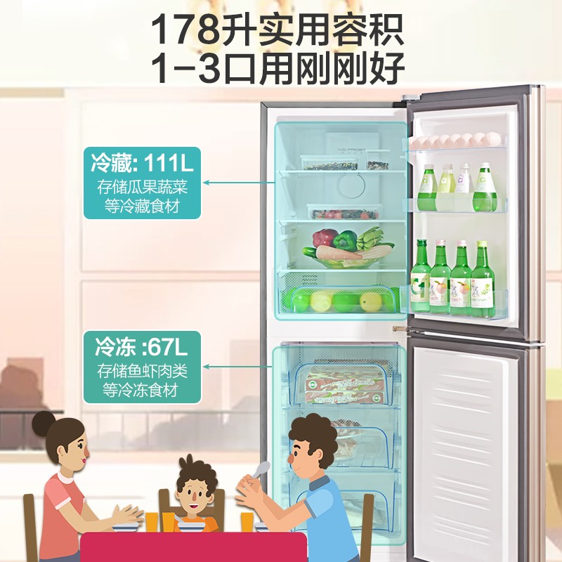 康佳178升风冷无霜双门冰箱小型家用电冰箱二门两门 节能省电低音超薄 迷你宿舍租房BCD-178WEGX2S价格:999.00元!