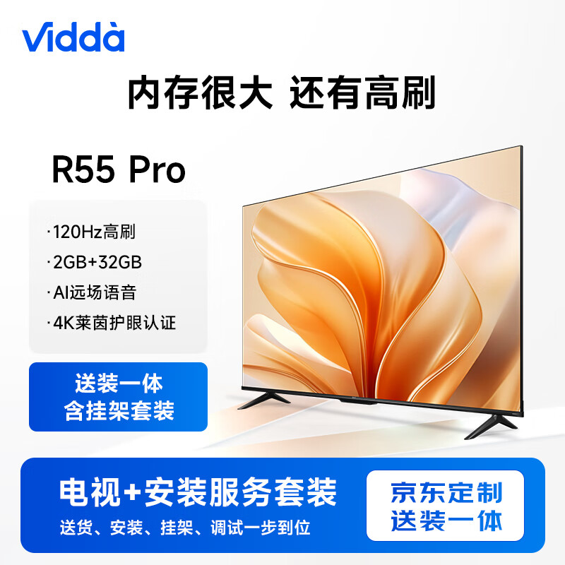 Vidda R55 Pro【送装一体版】海信 55英寸 120Hz高刷 2+32G 电视服务套装 送货 安装 挂架 调试一步到位价格:1749.00元!
