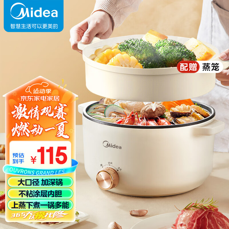 美的(Midea)电煮锅 电火锅 泡面锅 宿舍小火锅 蒸煮一体电蒸锅 多功能多用途电热锅 MC-HGE2511【配带蒸笼】3L价格:115.00元!