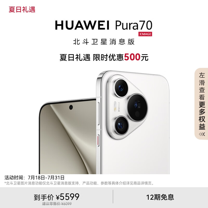 华为(HUAWEI)Pura 70 12GB+512GB 雪域白 北斗卫星消息版 超高速风驰闪拍 第二代昆仑玻璃 华为P70智能手机价格:5599.00元!