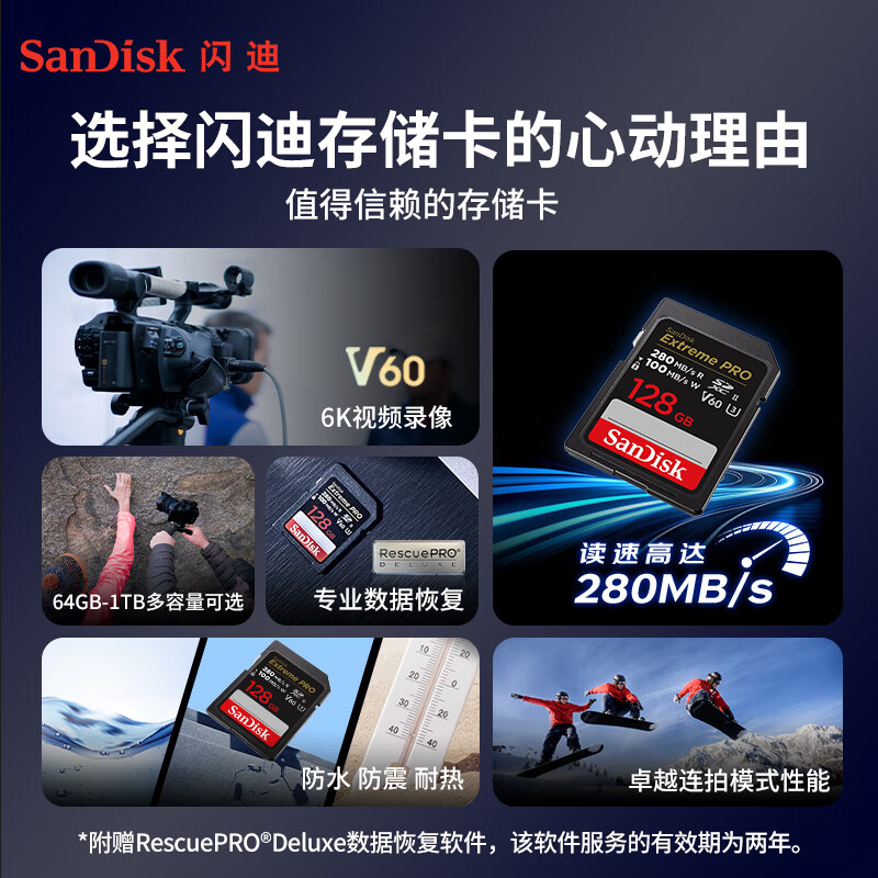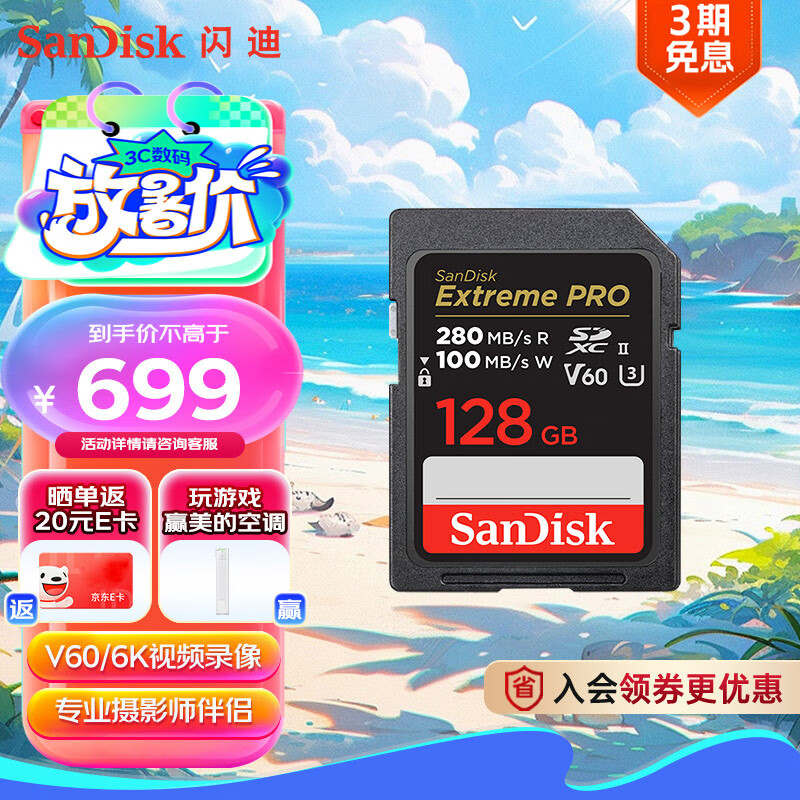 闪迪(SanDisk)128GB SD内存卡 6K视频 V60 U3 C10 高速相机存储卡 读速280MB/s 写速100MB/s 高清拍摄 畅快连拍价格:699.00元!