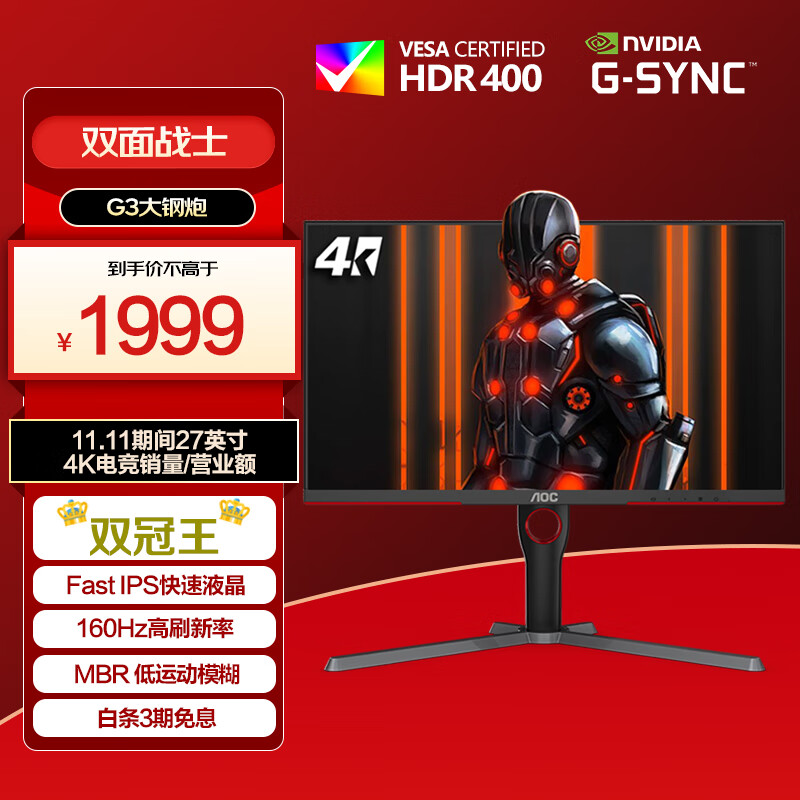 AOC 27英寸 4K高清 160Hz IPS快速液晶1ms HDR400 微边框 低蓝光不闪 PS4游戏电竞电脑显示器 U27G3X价格:1999.00元!