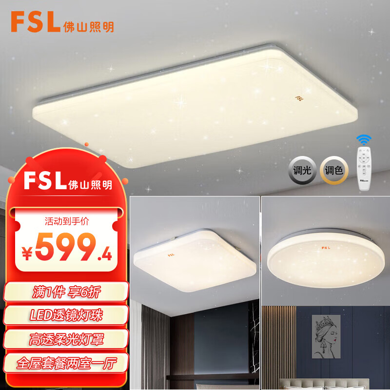 FSL佛山照明灯具套餐LED吸顶灯智能客厅卧室灯遥控调色两室一厅54060价格:999.00元!