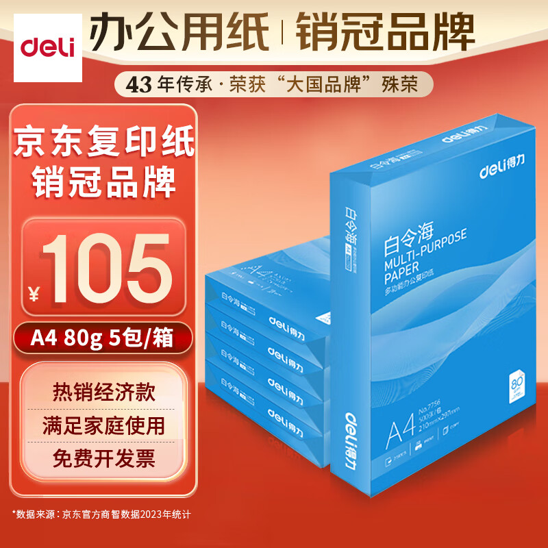 得力(deli)白令海A4打印纸 80g500张*5包一箱 双面加厚 高性价比复印纸 整箱2500张 7763【经济热销】价格:105.00元!
