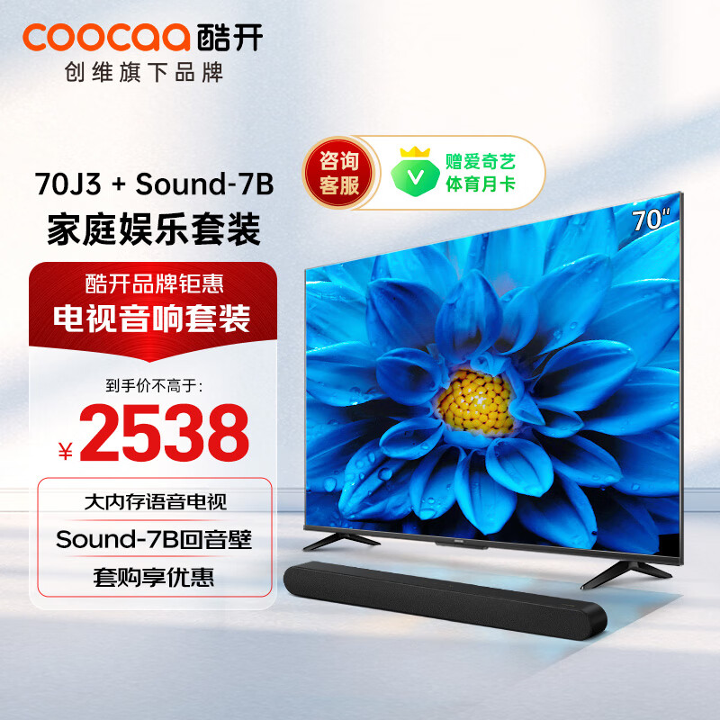 酷开创维J3 70英寸电视 大内存语音声控电视机+Sound-7B木制回音壁 家庭影院KTV 立体环绕DSP数字音响价格:2538.00元!