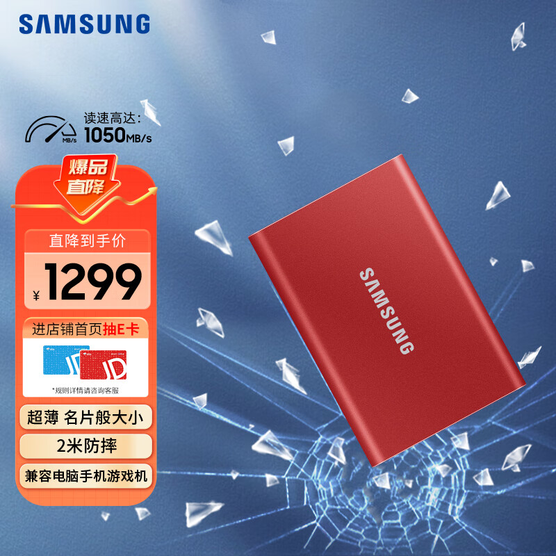 三星(SAMSUNG) 2TB Type-c USB 3.2 移动固态硬盘(PSSD) T7 红色 NVMe传输速度1050MB/s 超薄时尚价格:1299.00元!