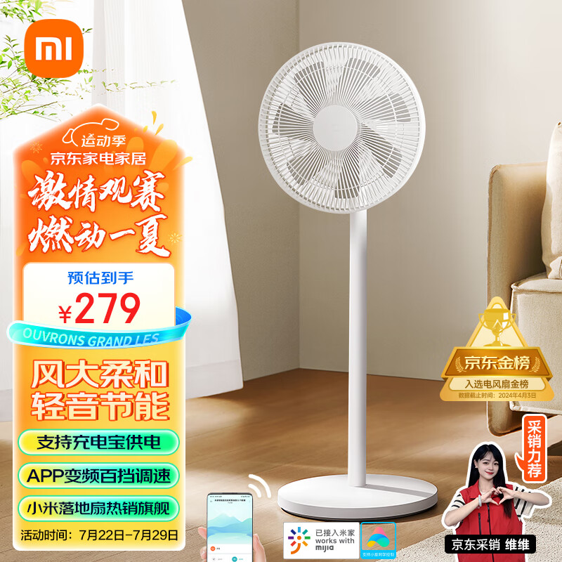 米家小米电风扇落地扇家用 直流变频自然风大广角轻音节能电扇1X升级版 充电宝供电 智能控制价格:279.00元!