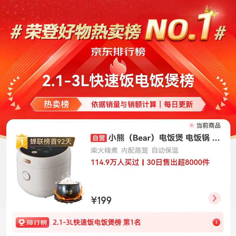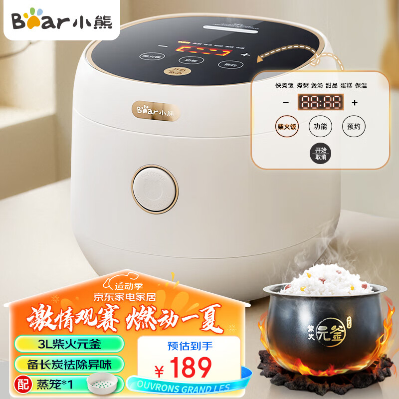 小熊(Bear)电饭煲 电饭锅 家用3-4人 多功能3升智能防溢预约元釜柴火饭 迷你米饭锅 DFB-C30L3 3L价格:189.00元!