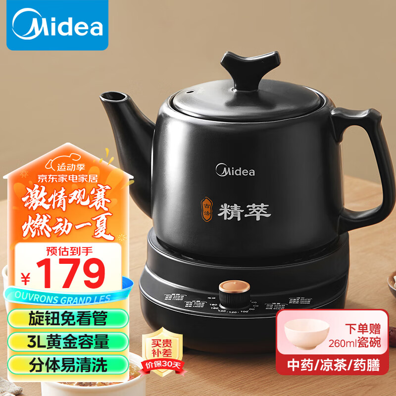 美的(Midea)煎药壶中药壶养生壶熬药分体3L大容量陶瓷家用砂锅药罐全自动智能中药煲药膳滋补熬药锅JYE3011价格:239.00元!
