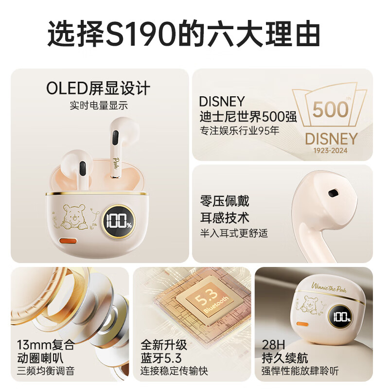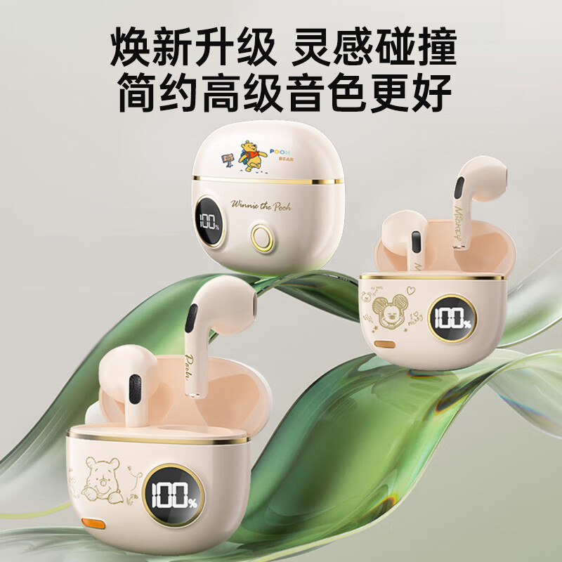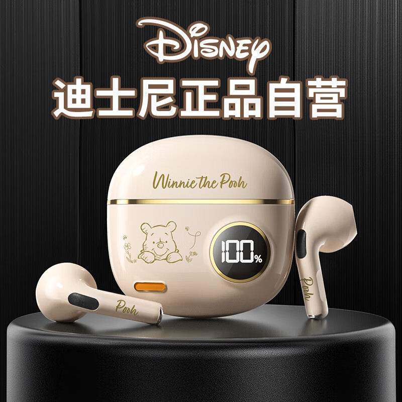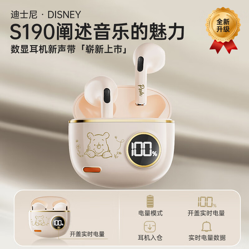 迪士尼(DISNEY)【千元音质|LED智能显屏】真无线蓝牙耳机半入耳式游戏降噪隐形跑步运动生日礼物S190【米色维尼】价格:109.00元!