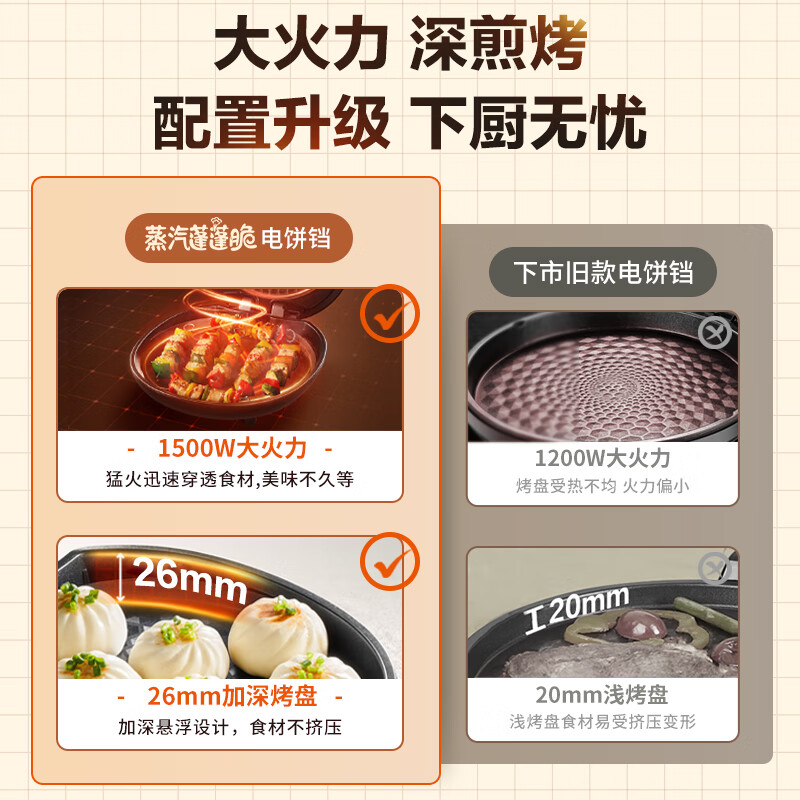 苏泊尔(SUPOR)电饼铛家用 电饼档 煎饼锅 煎烤机烙饼锅三明治机26mm加深 早餐机 升级蒸汽烤盘 JJ30A648-Q价格:109.00元!