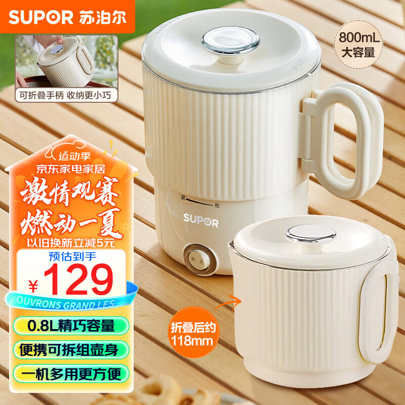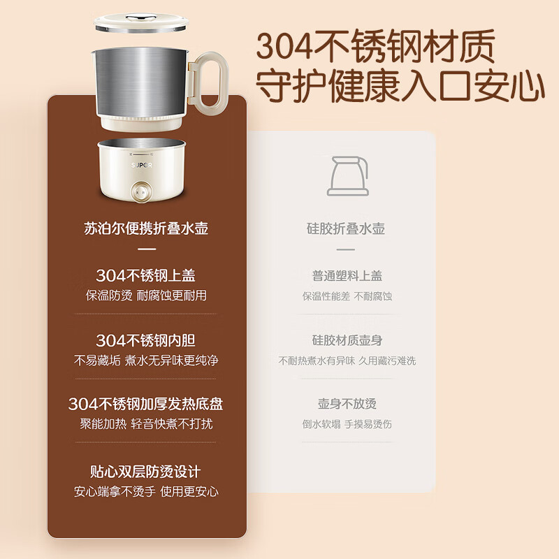 苏泊尔(SUPOR)便携式烧水壶电水壶折叠不锈钢水壶 烧水杯旅行出差家用水壶养生冲奶电热水壶学生泡面杯 SW-08J01价格:129.00元!
