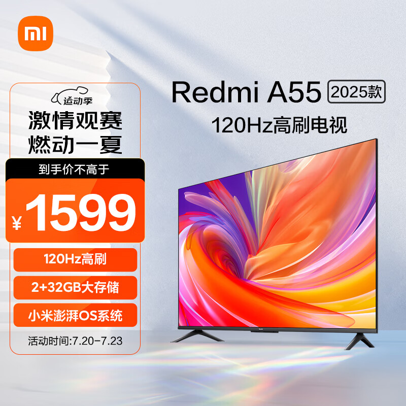 小米电视 55英寸2025款 120Hz 2+32GB 4K超高清 小米澎湃OS 金属屏平板电视Redmi A55 L55RB-RA价格:1599.00元!