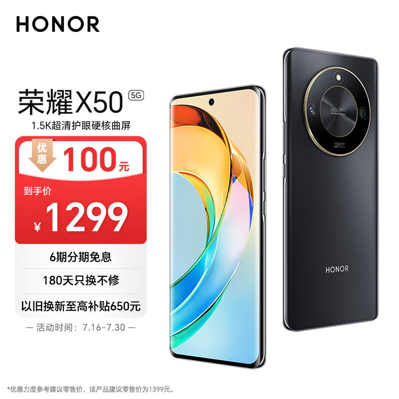 荣耀X50 代骁龙6芯片 1.5K超清护眼硬核曲屏 5800mAh超耐久大电池 5G手机 8GB+128GB 典雅黑价格:1399.00元!