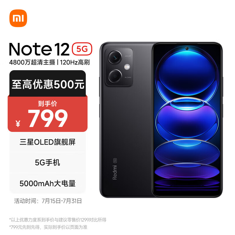 小米(MI)Redmi Note12 5G 手机 120Hz OLED屏幕 骁龙4移动平台 5000mAh 8GB+256GB子夜黑 t turbo价格:799.00元!