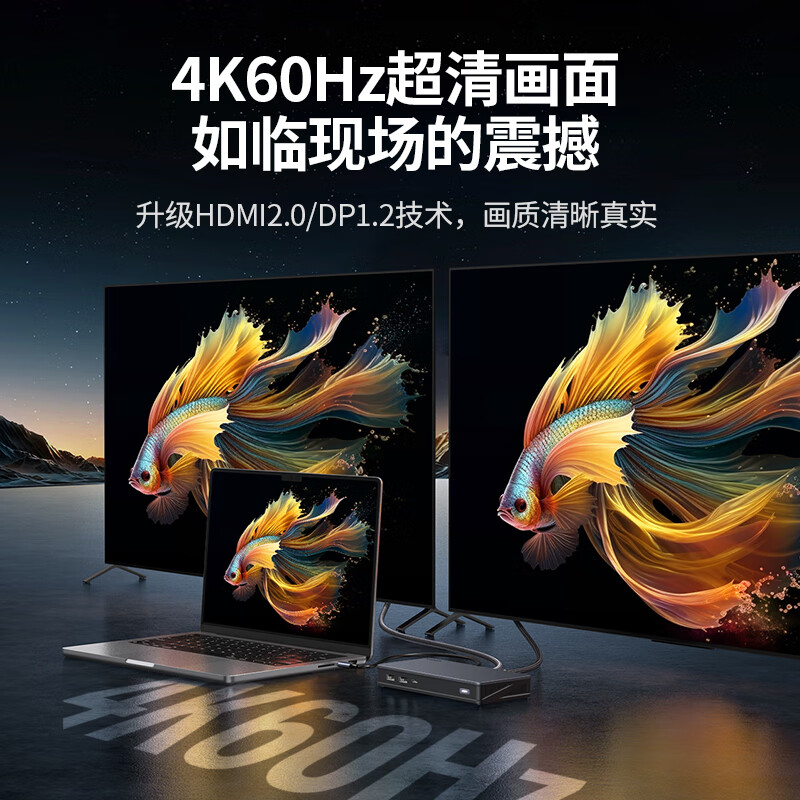 4、颜色好看,和苹果笔记本很搭。金属质感,接口丰富,能接2个显示器。数据传输快,完全满足日常需求。可接网线,有线上网更快。使用一阵子,容易发烫。没法4K60HZ。