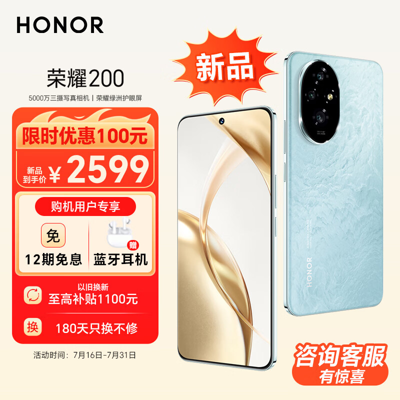 荣耀200 新品 旗舰级青海湖电池 绿洲护眼屏 5000万雅顾光影主摄 第三代骁龙7 AI 12+256 天海青 5G价格:2599.00元!