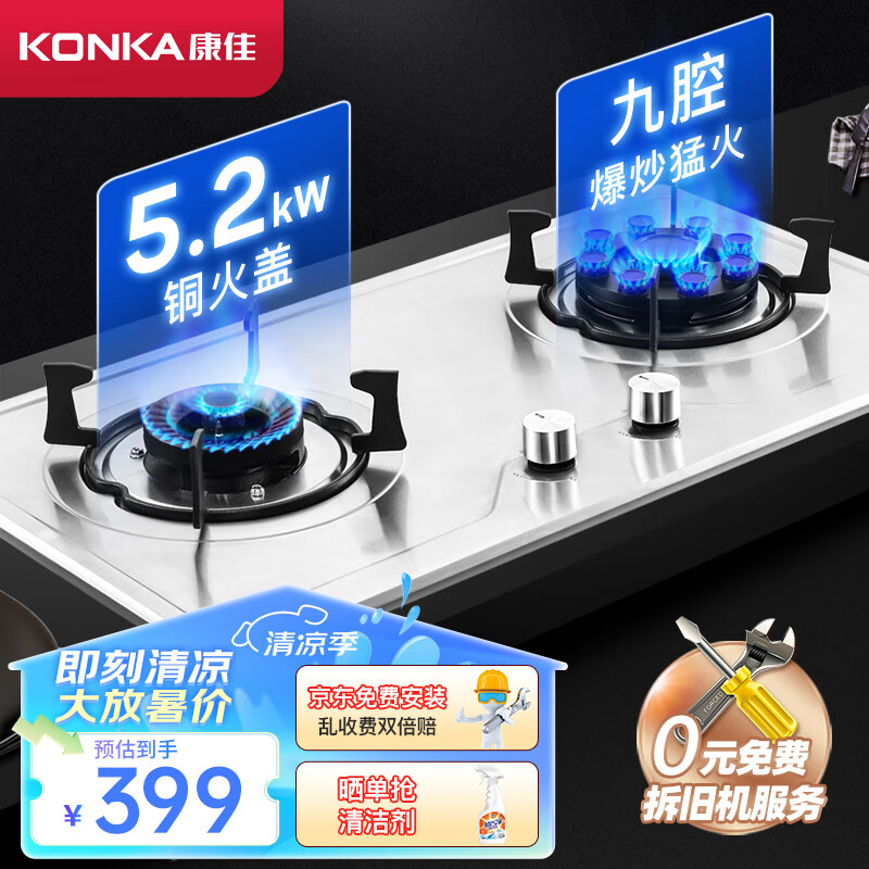 康佳(KONKA)燃气灶双灶 家用5.2kW九孔聚能猛火爆炒鸳鸯灶具 台式/嵌入式不锈钢灶台 JZT-G900Y(天然气)价格:398.00元!