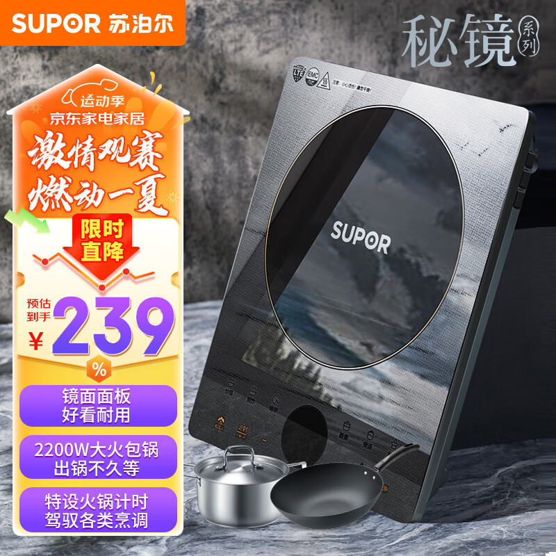 苏泊尔(SUPOR)秘镜系列家用电磁炉2200W大功率猛火电磁灶爆炒炒菜电池炉智能定时多功能套装全套带锅C22-IH80E价格:239.00元!