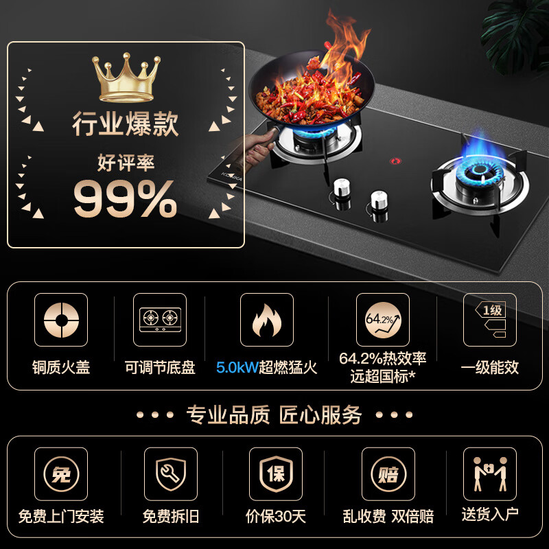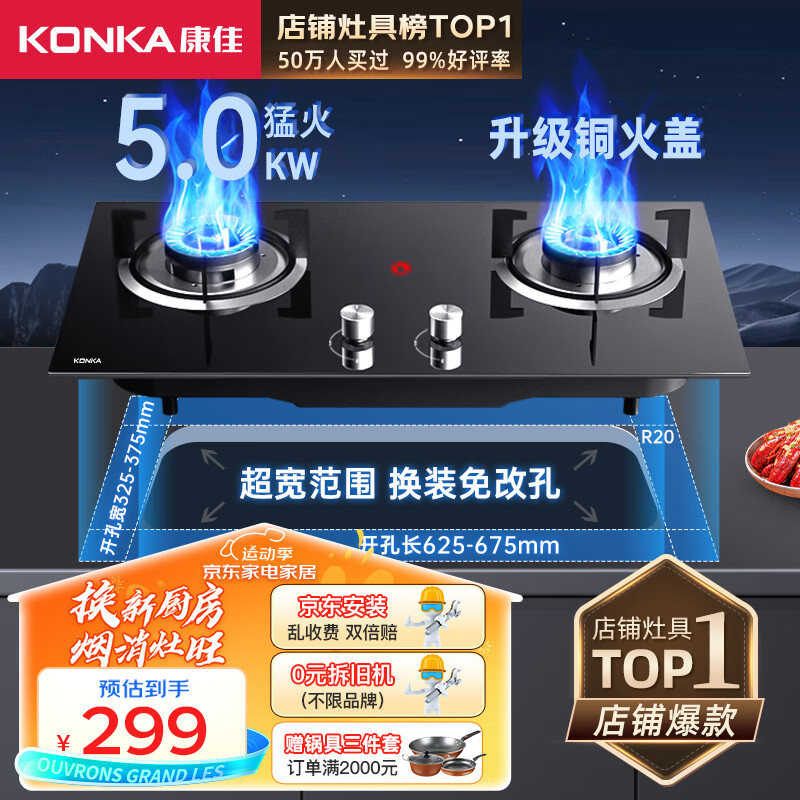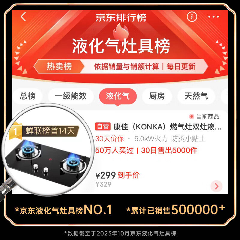 康佳(KONKA)燃气灶煤气灶双灶家用 5.0kW液化气嵌入式台式双灶具 玻璃面板煤气炉灶台JZY-B500Y(液化气)价格:298.00元!