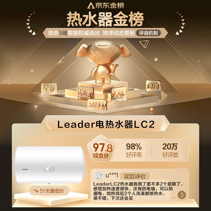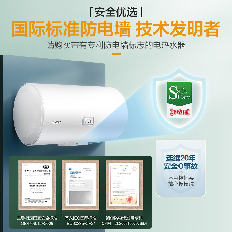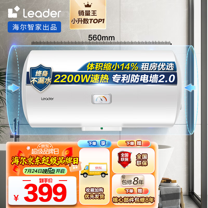 海尔智家出品 Leader电热水器40升 2200W保温家用 多重防护 专利防电墙 LES40H-LC2(E)价格:399.00元!