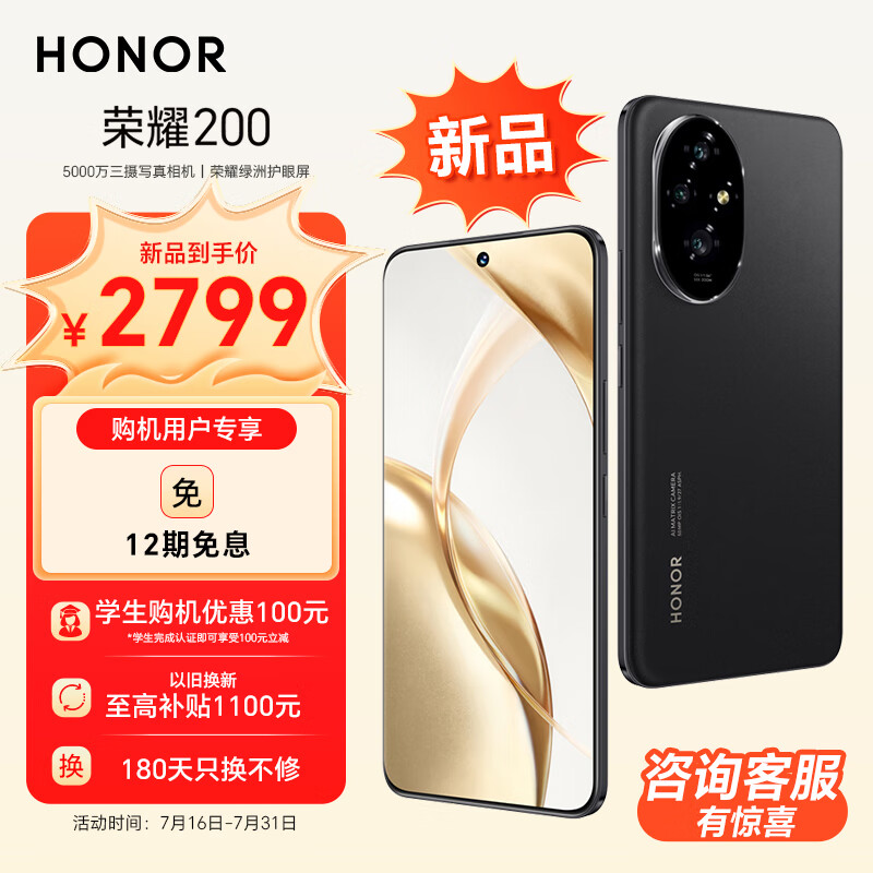 荣耀200 新品 旗舰级青海湖电池 绿洲护眼屏 5000万雅顾光影主摄 第三代骁龙7 AI 16+256 绒黑色 5G价格:2799.00元!