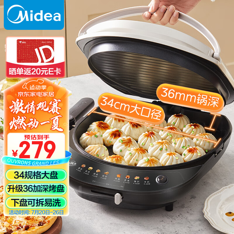 美的(Midea)电饼铛家用大尺寸下盘可拆洗三明治机早餐机煎饼锅蒸汽加大加深双面加热独立控温烙饼锅电饼档3458价格:279.00元!