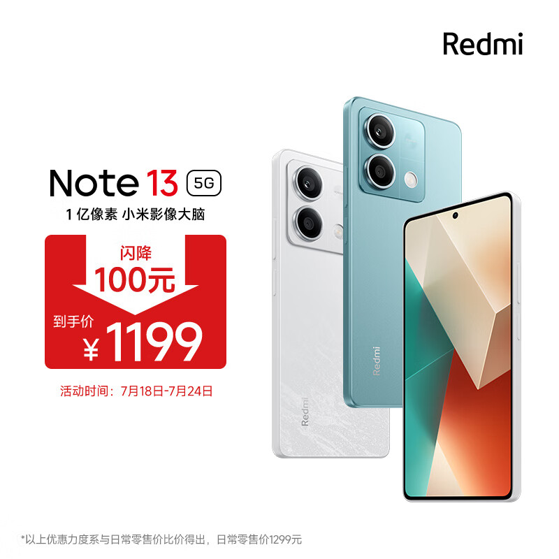 小米Redmi Note13 5G 1亿像素 超细四窄边OLED直屏 8GB+256GB 时光蓝 SU7 5G手机价格:1199.00元!