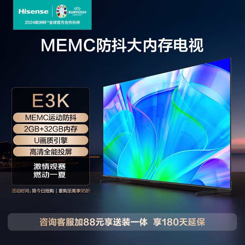 海信电视55E3K 55英寸 MEMC防抖 2GB+32GB U画质引擎 4K高清智慧屏 客厅家用液晶平板电视机价格:1699.00元!