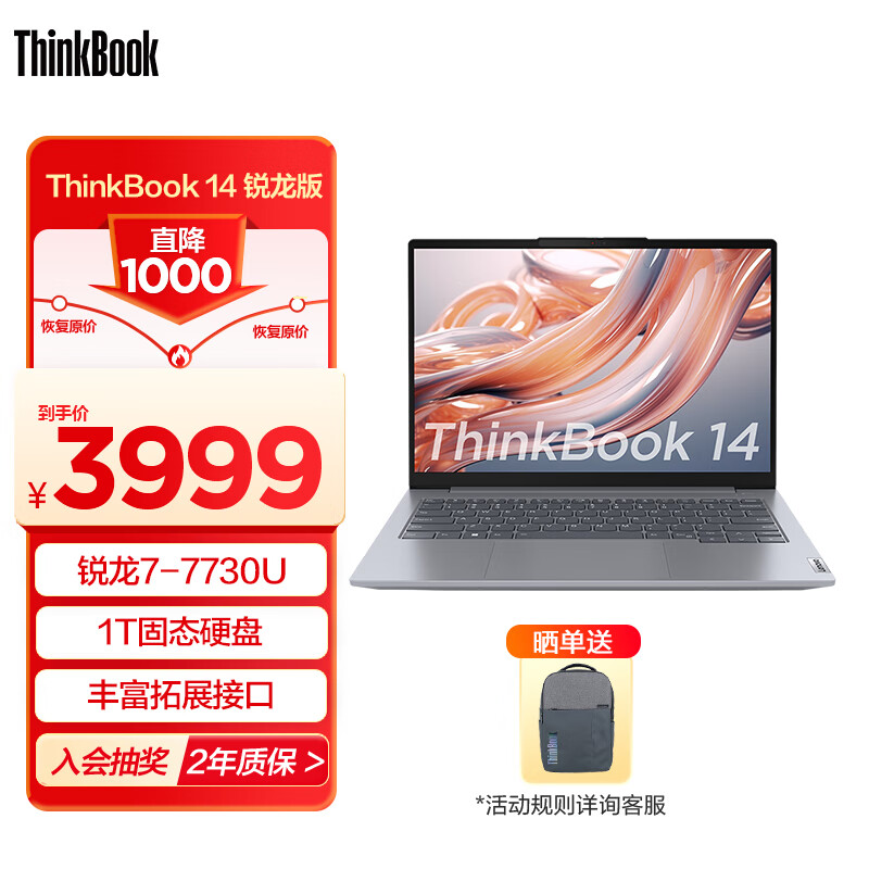 ThinkPad联想ThinkBook 14/16锐龙版 商务轻薄笔记本电脑 2023新品 14英寸:R7-7730U 16G 1T 24CD价格:4999.00元!