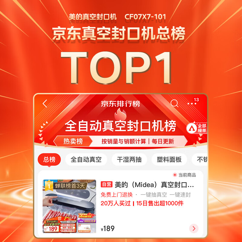 美的(Midea)真空封口机 家用小型全自动真空包装机 食品塑封机干湿两用大吸力真空保鲜打包机 MJ-CF07X7-101价格:185.00元!