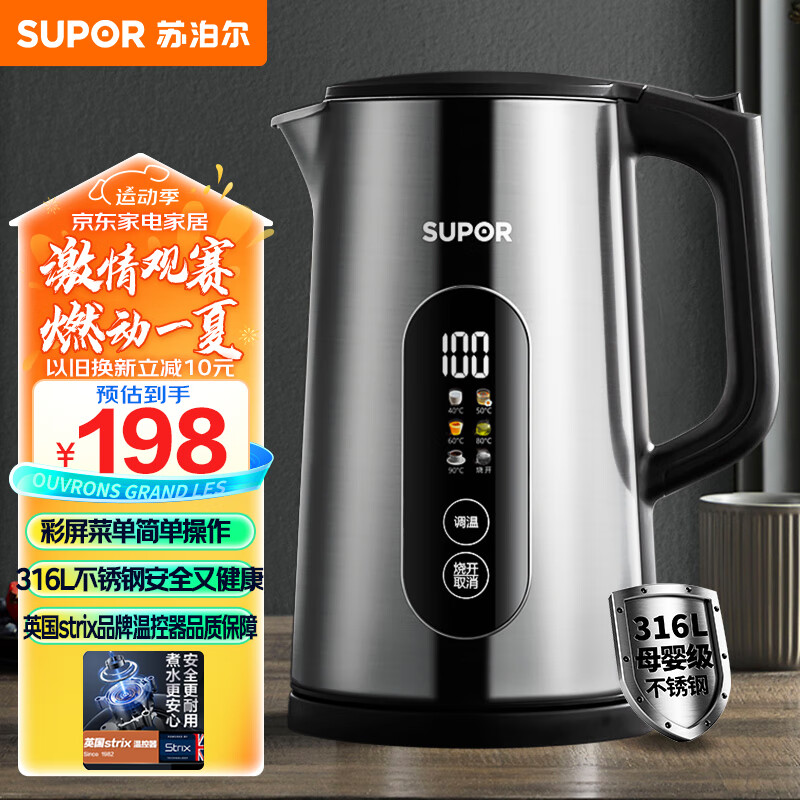 苏泊尔(SUPOR)电热水壶 1.7L大容量 调温保温恒温烧水壶 大屏实时显温 食品级316不锈钢电水壶SW-17J60A价格:198.00元!