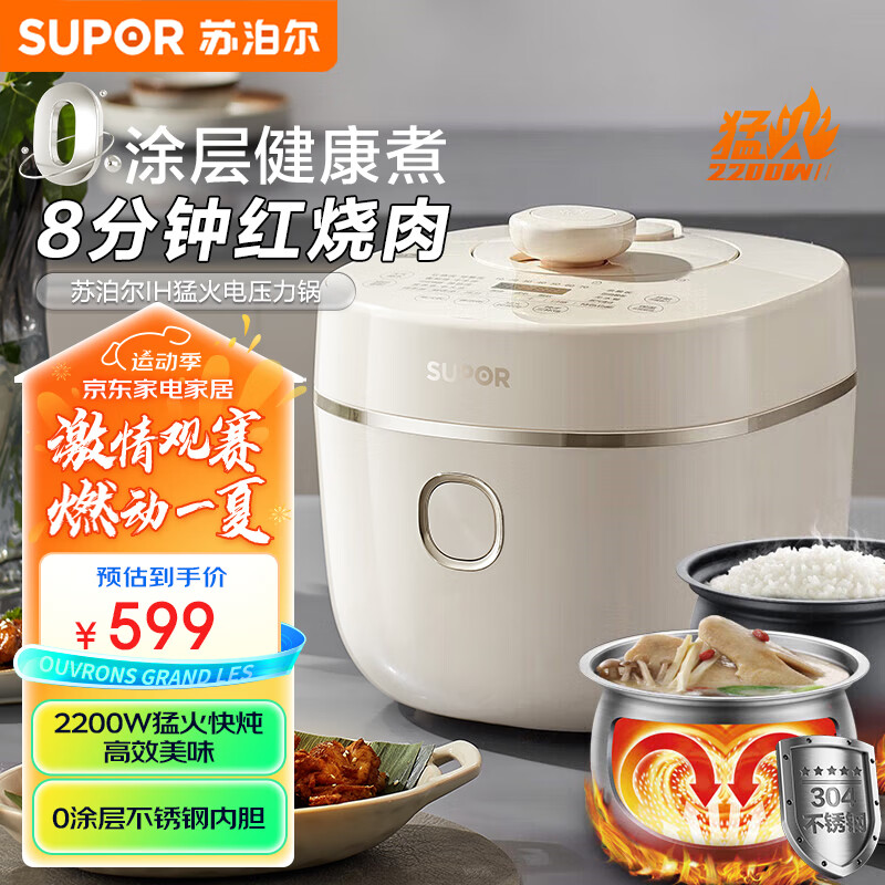 苏泊尔IH猛火系列电锅5L 家用全智能2200W 0涂层钢釜8min快速菜双胆SY-50HC5021Q电饭煲高压锅3-6人价格:679.00元!