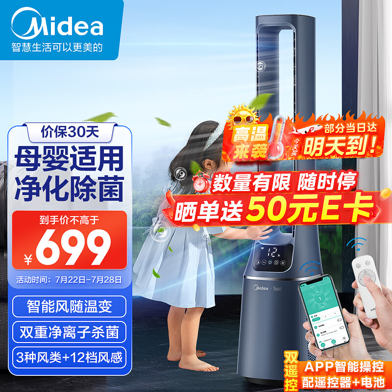 美的(Midea)【双重杀菌】WIFI风随温变无叶风扇/净化扇/家用遥控落地扇/电风扇/定时塔扇/轻音风扇AMS150E-TM价格:699.00元!