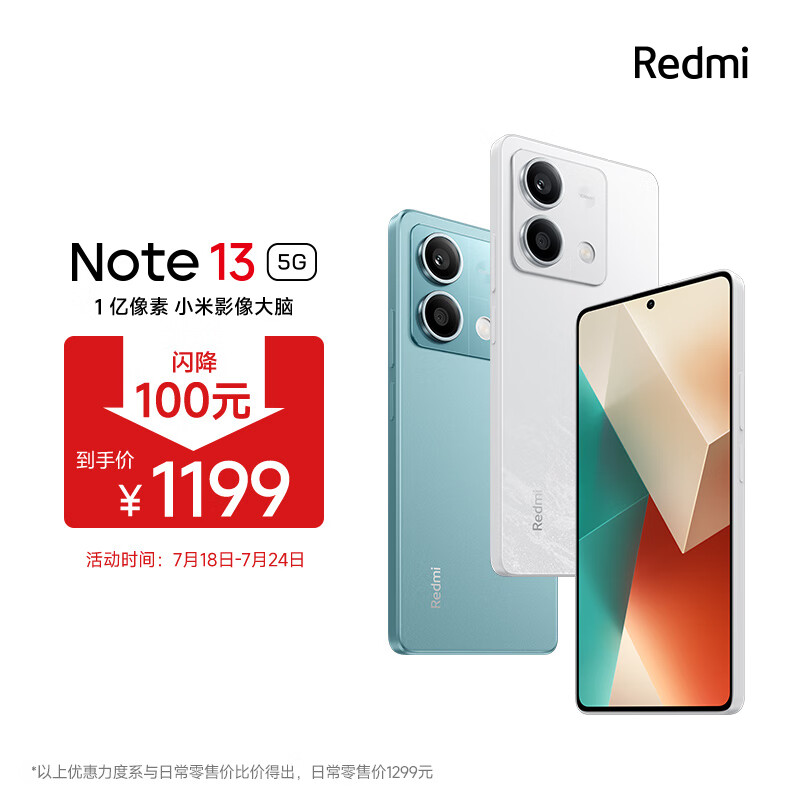 小米Redmi Note13 5G 1亿像素 超细四窄边OLED直屏 8GB+256GB 星沙白 SU7 5G手机价格:1199.00元!