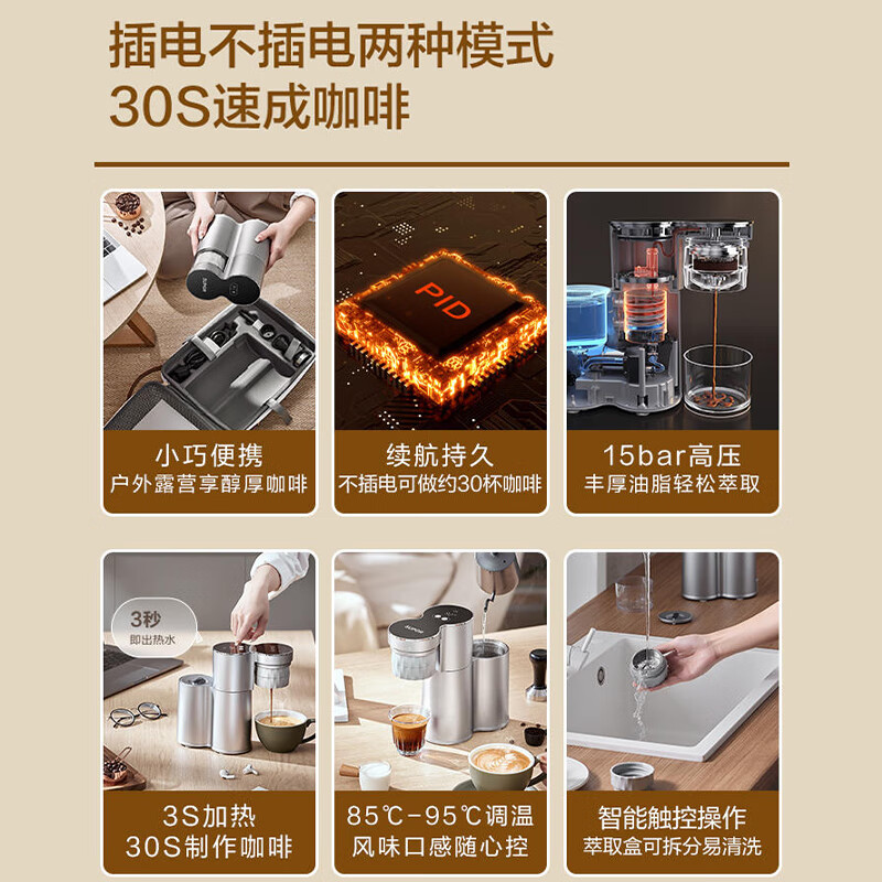 4、这款咖啡机真的很便携,重量很轻,操作简单,清洗方便,加热很快,还有收纳包。双十一还送充电电动磨豆机手冲套装,意式手冲一次搞定,都是充电款,适合露营,体验超棒!