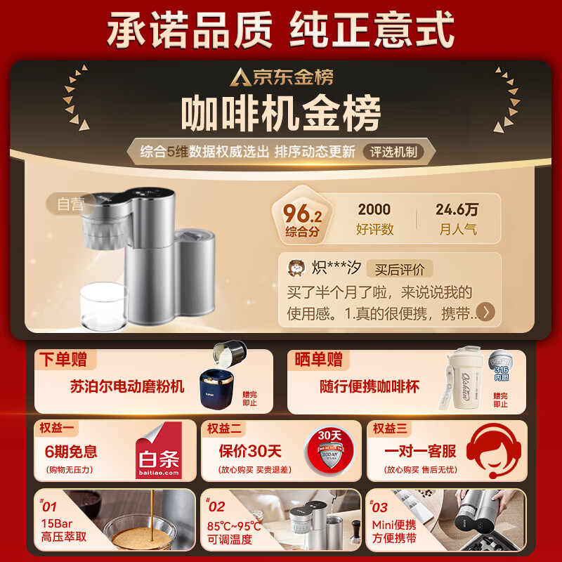 3、这款咖啡机精致小巧,办公室或露营太适合了。萃取的浓缩油脂细腻,口感媲美半自动咖啡机。充电或插电都可用,给苏泊尔的咖啡机点赞??