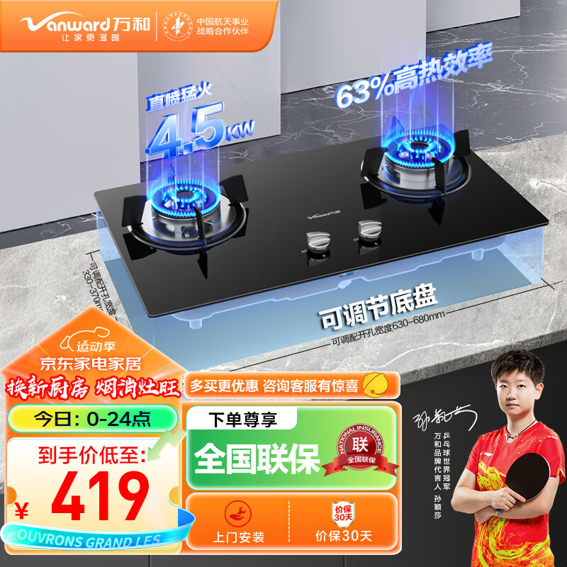 万和(Vanward)燃气灶4.5KW大火力 家用台式嵌入式两用 燃气灶具 双眼灶 63%热效率 JZT-B5L30(天然气)价格:419.00元!